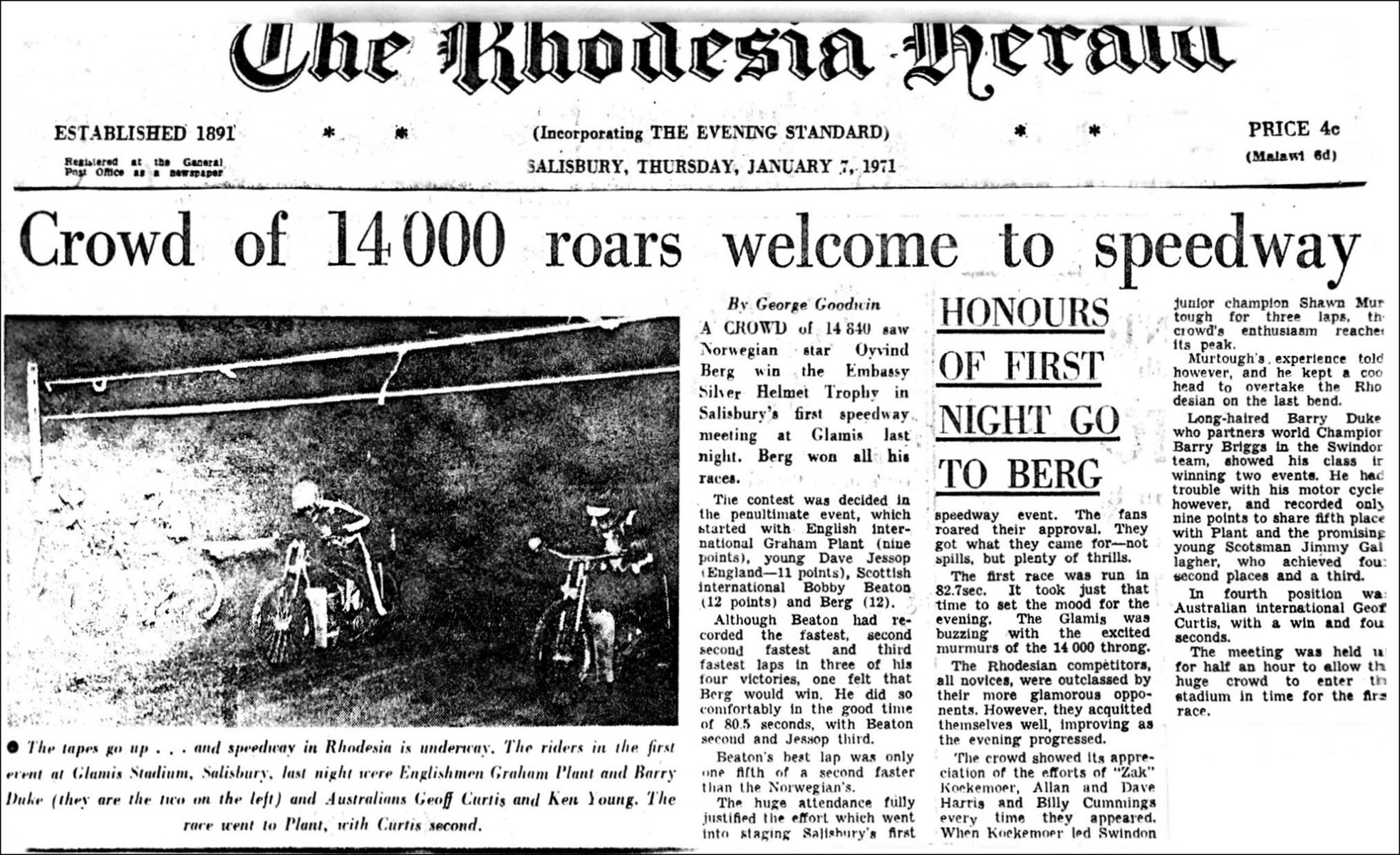 After the bankruptcy of the Underwood promotion in 1975 following the WCSS meetings and the disposal of all Bulawayo Showground track equipment, solo speedway ended there but continued for one more year at the Glamis Stadium, Salisbury under the auspices of the Mashonaland Stock-Car Racing Club as one of the many 2-, 3- and 4-wheel race classes, when the final curtain came down on solos at the end of 1976. There was to be no more solo speedway in Rhodesia.
