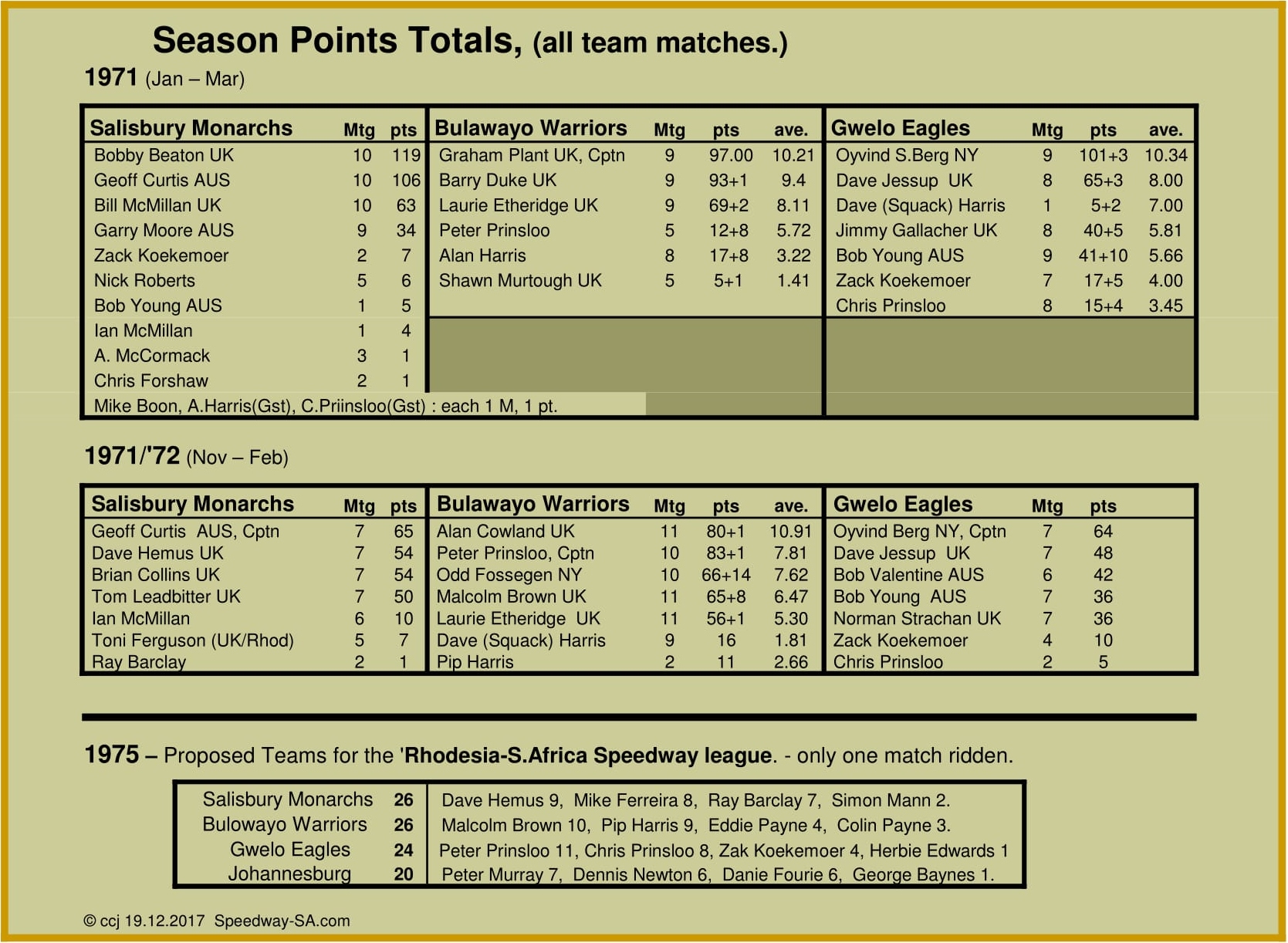 Shown below are the Fixture Lists of each Rhodesian season during the '70s, along with all known results. After 1973 the speedway seasons were limited to March-to-December, to avoid the rainy period.