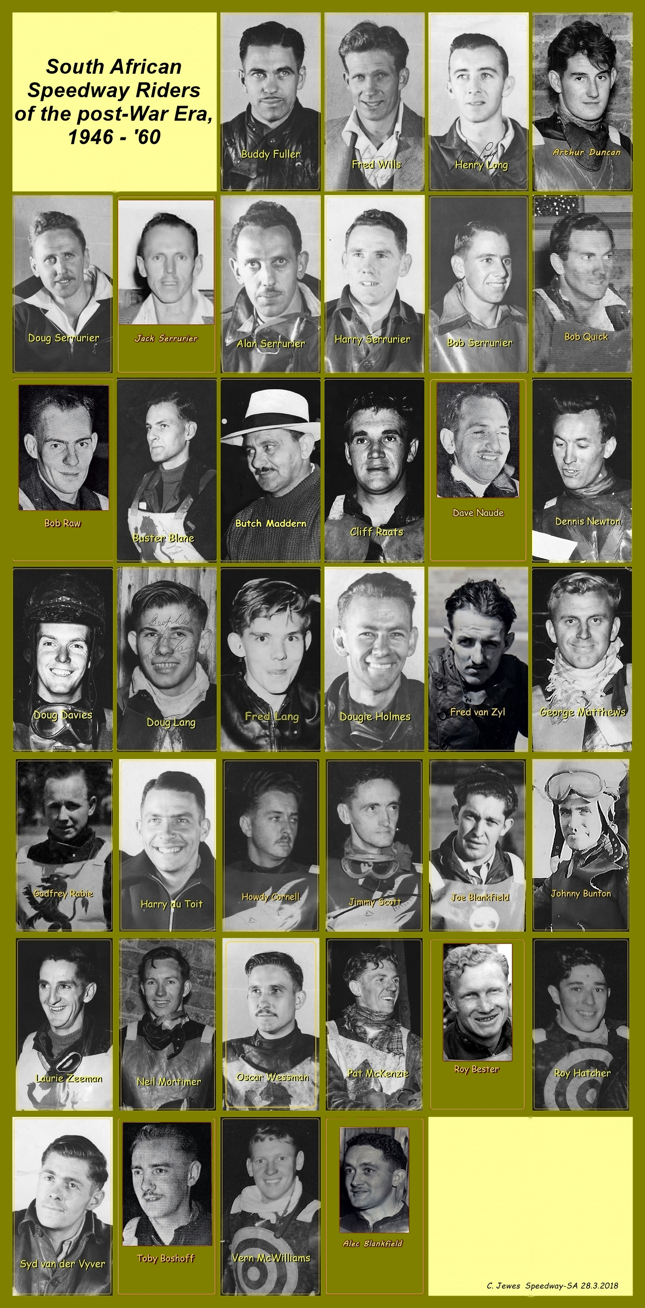 "South African car racing legend Syd van der Vyver c.1950, in earlier speedway mode. Syd rode for Leicester, UK, in '49 and also wore South African colours in tests. He was also a stunt rider for Putt Mossman when the American brought his circus to South Africa just before WW2. He retired in 1953 and turned to car racing. He also went into partnership in a Durban garage with New Zealand speedway rider Dick Campbell, when both raced Formula Three cars."
