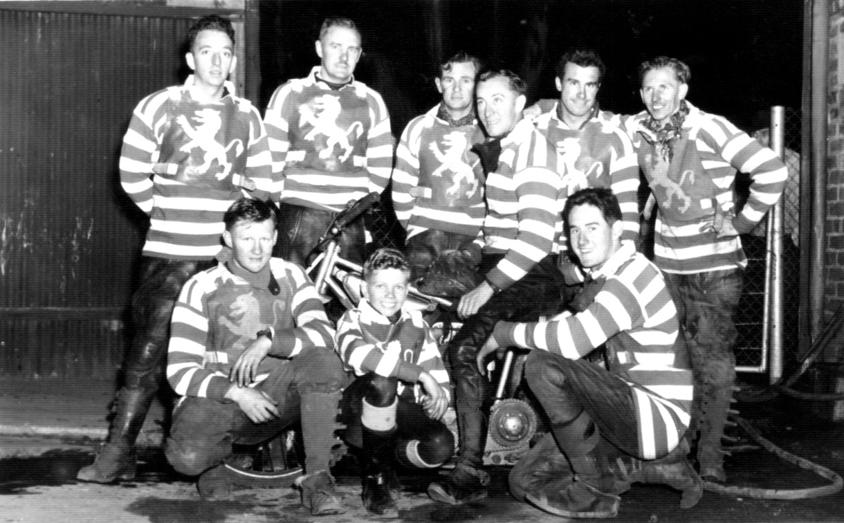 Wembley team 1956/7: Ken Long, Toby Boshoff, Jimmy Meade, Henry Long (on bike), Peter Williams, Pat Mckenzie; kneeling: Aubrey Long, Arthur Duncan.
