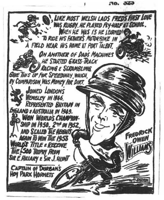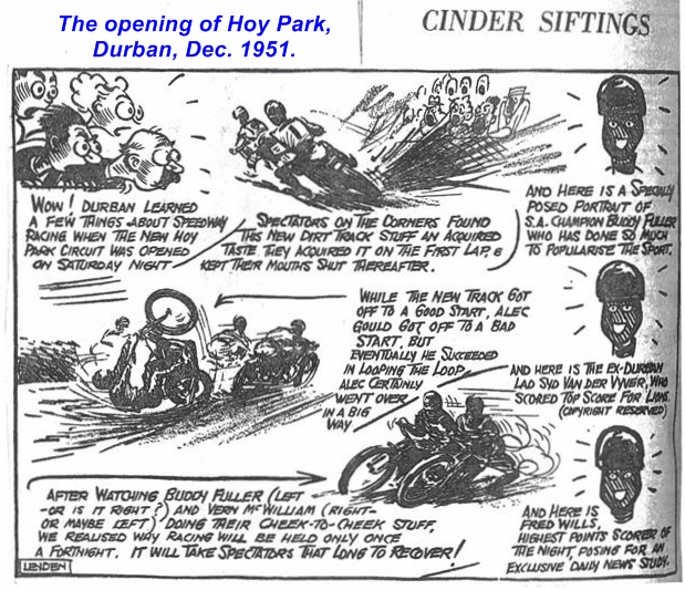 Some recent pleasant memories from Peter Williams. Unfortunately others remain: the tour ended badly on return to Britain in 1957 when the British riders involved in this '56/'57 South African season with Buddy Fuller were charged, fined and received a UK riding ban from the RAC/SCB on the basis that the Fuller tracks, including Wembley, were unlicensed.