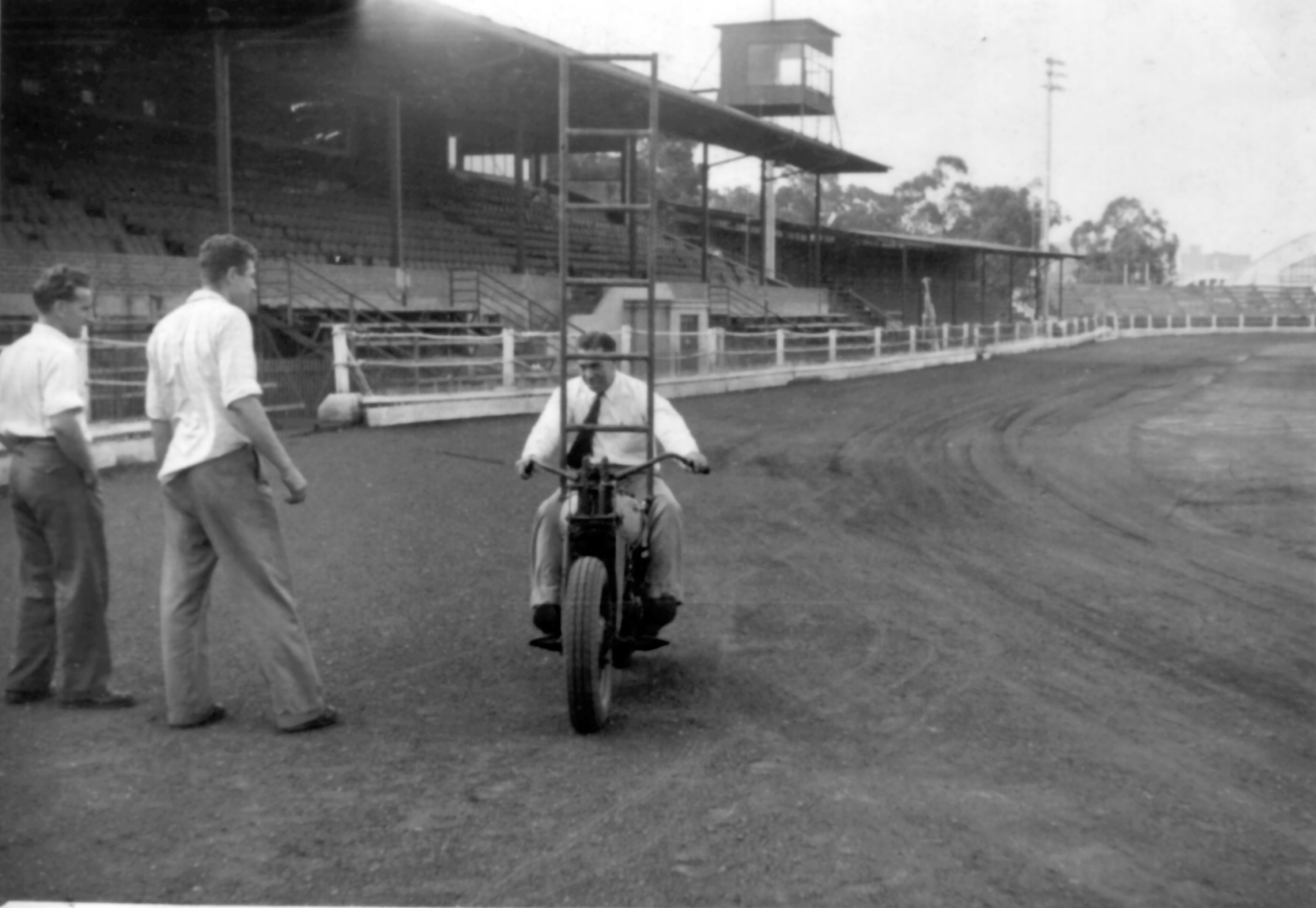 "A speedway yarn about Syd worth sharing. Prior to moving to Durban in the early '50s, Syd was in charge of the workshop at Wembley Stadium (out of sight of the spectators) maintaining and repairing the bikes. At the opening meeting (28 Nov.1947) several male spectators stopped going all the way to the gents and used the pit wall as a urinal. Syd nipped into the workshop, rigged up a spare generator and ran a cable along the pit wall. The practice stopped as quickly as it had started."