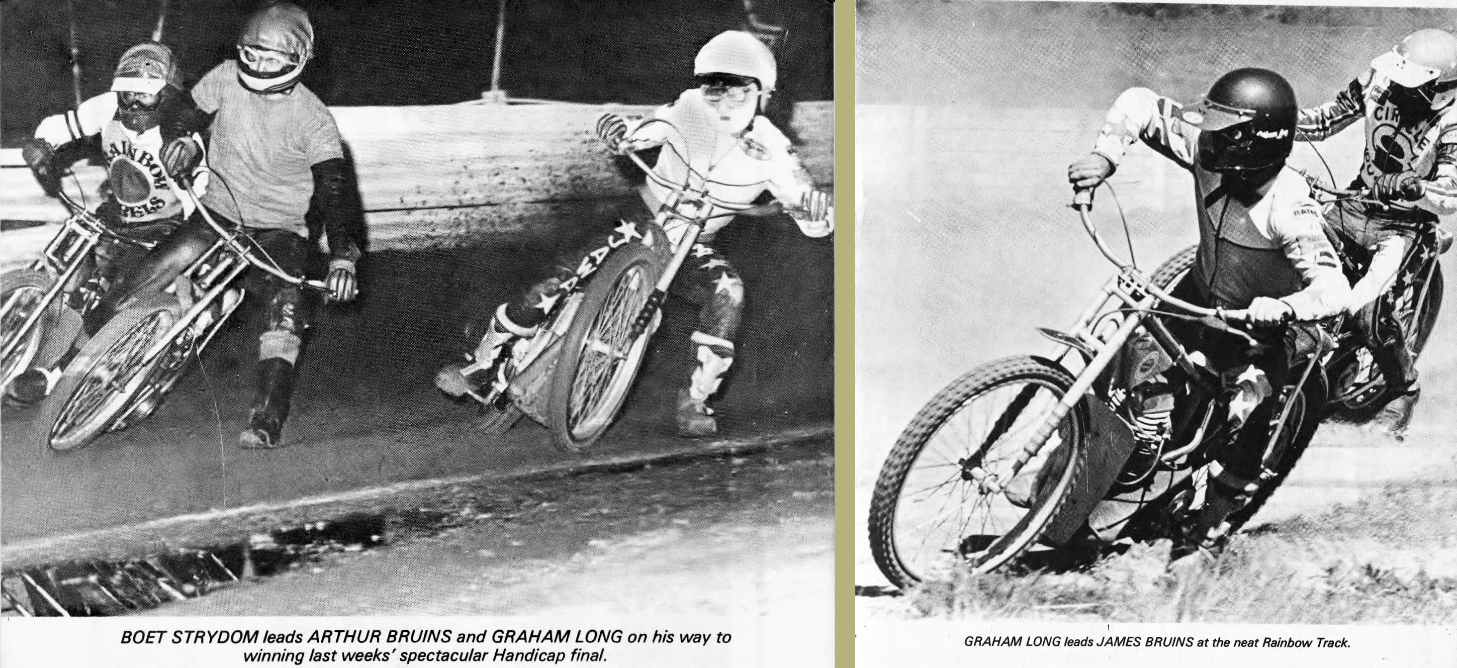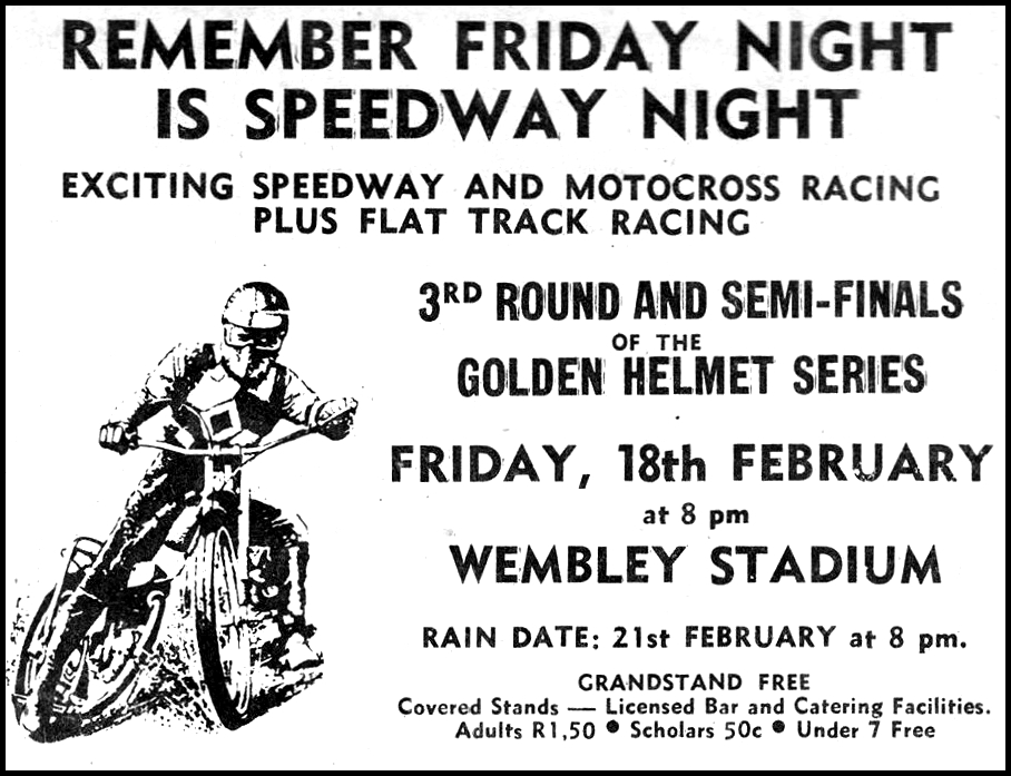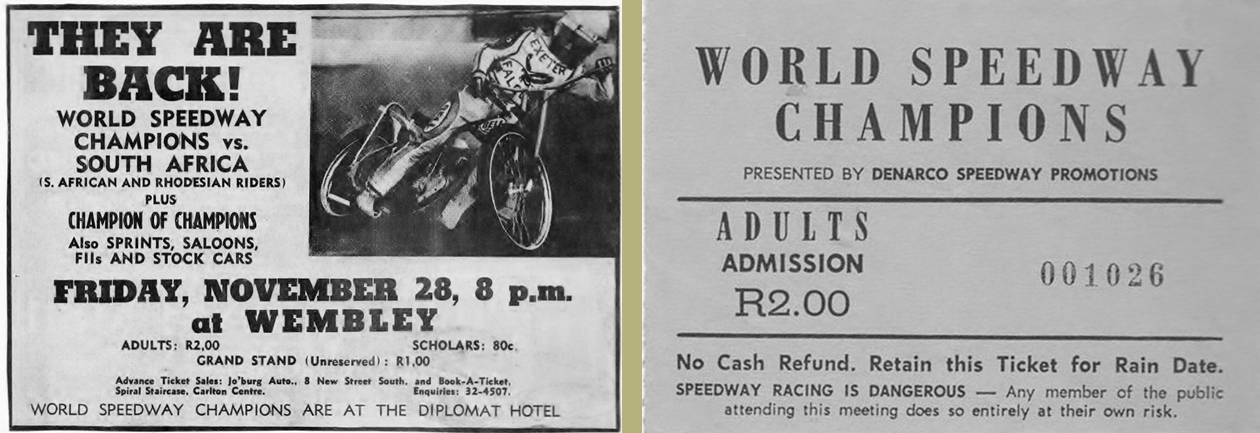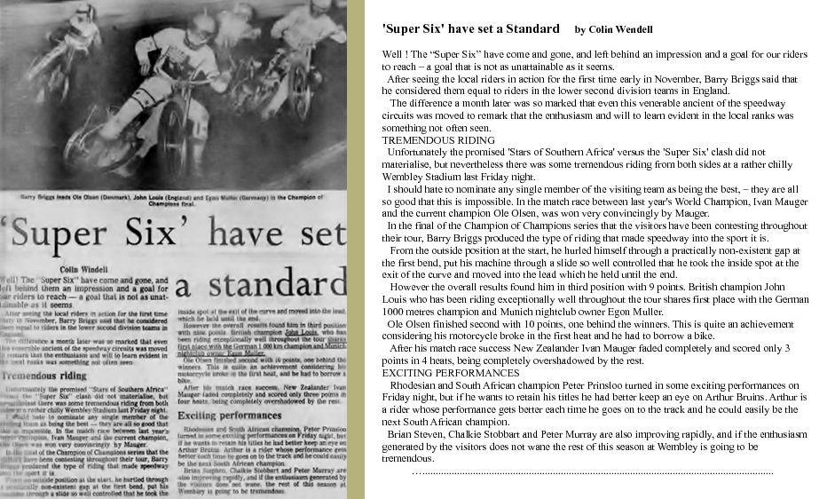 A Briggs- & Mauger-led troupe of past, present and future World speedway champions toured South Africa and Rhodesia in November 1975. Meetings were staged at Jo'burg (Nov.7th & 28th), Durban (8th & 29th) Cape Town (21st), Salisbury (14th), and Bulawayo (15th.)
