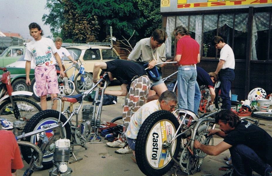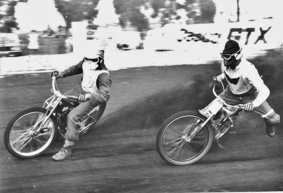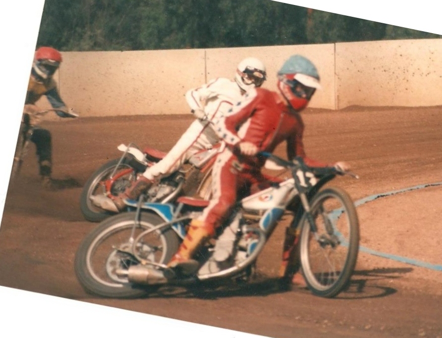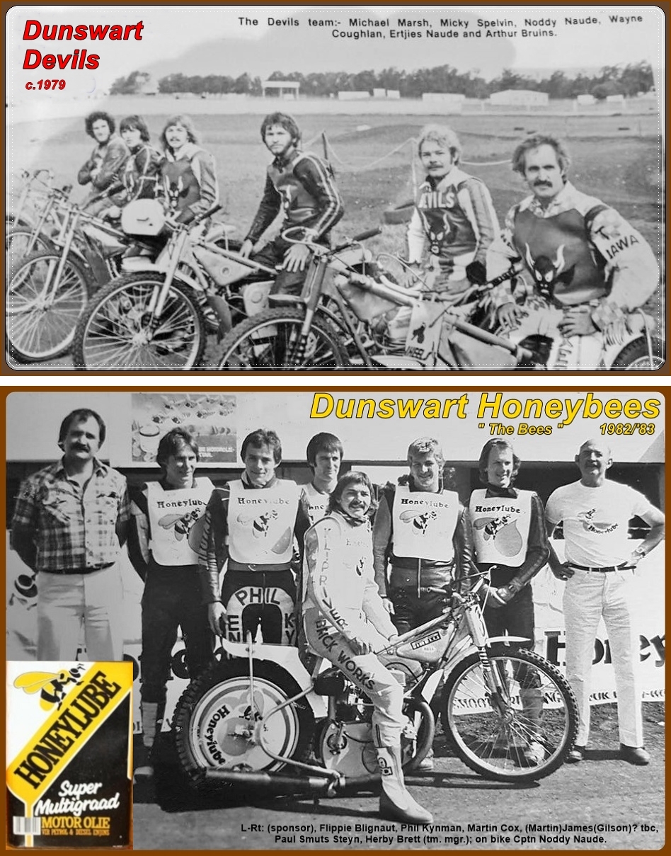 Two teams emerged in the Republic near the end of the 'seventies, – Tarlton Tomahawks and Dunswart Devils – , representing the two existing Transvaal tracks. They were formed to provide team racing for the public to supplement the repetition of individual meetings, but seems to have been only moderately successful as the fans tired of matches between the same two teams. The first photograph, showing the Devils team of around 1979, captained by Arthur Bruins, is thought to probably have been taken at Tarlton, it being a large 400m-plus track.