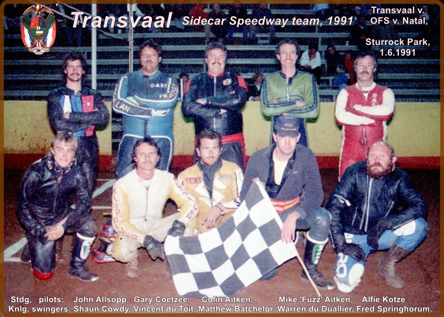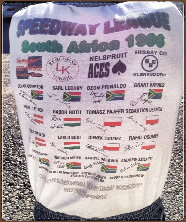 This T-shirt, right, clearly identifies the composition, - teams and riders - , of a 4TT league set up in 1996, which seems to have been the forerunner of the similarly- structured 'National Speedway Association League' operating between 1997 and '99, ( see article “Speedway League Racing in South Africa, Pt. 2: 1977 – 2003”, on the Speedway History page.)