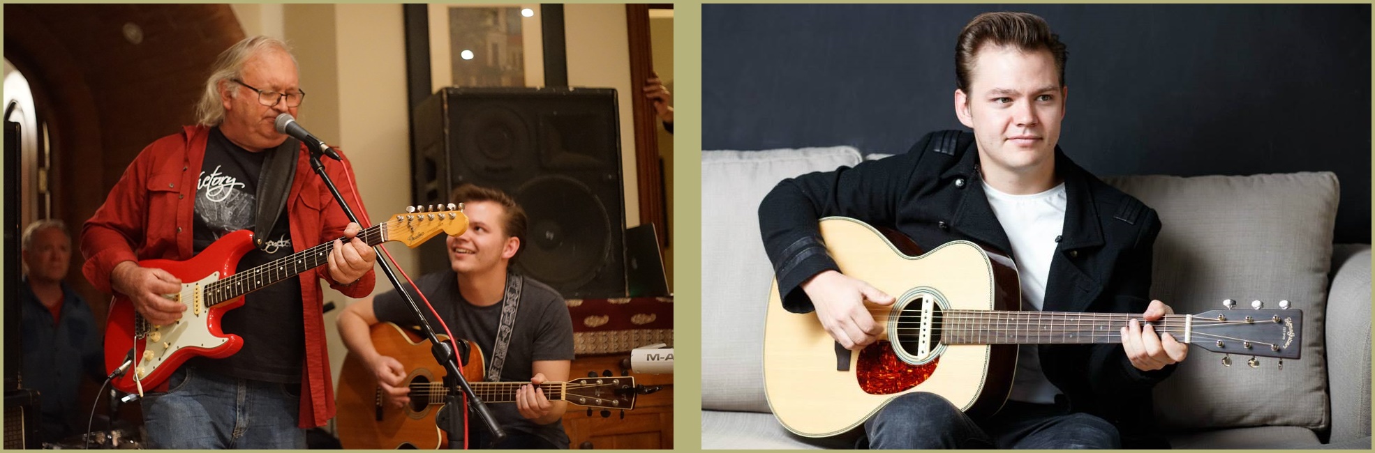 Father and son: present-day Wayne and Brendan Coughlan in 2015, performing together on guitar.