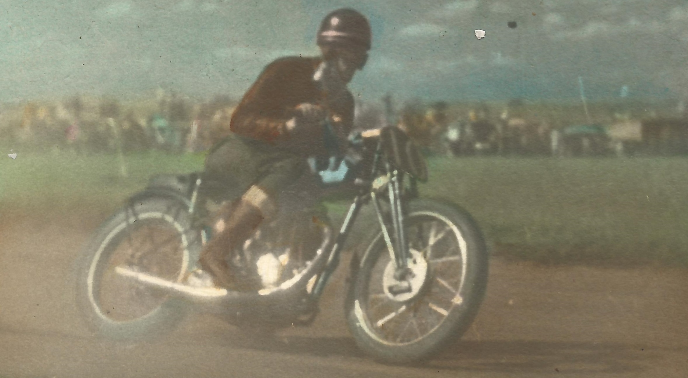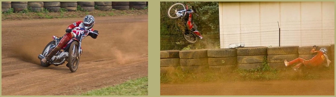 Brad Zeeman is the grandson of Laurie Zeeman who rode speedway for Johannesburg Tigers in 1947 but had greater success and fame in the '50s as a Road racer in the 350 Class, first with a Velocette and then an AJS. He is seen below in a rare colour photo of that time at Old Barn Speedway, Alberton, on his stripped down Triumph 500cc Tiger where he rode with Buddy Fuller, Henry Long, Fred Wills and others. Brad, who took 3rd place in the 2001 U21 SA Championship is seen at Walkerville around 2008, when he last raced.