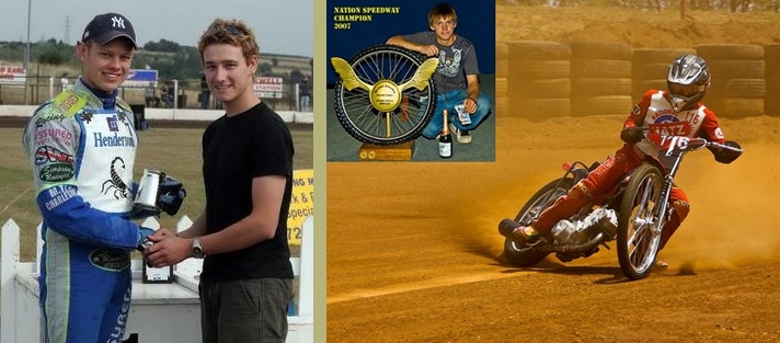 Seen below, Byron Bekker receives a special recognition award for 100 consecutive league appearances for his UK club, Scunthorpe Scorpions, at the Lincolnshire track in 2008. Brendan Coughlan is seen in action at Walkerville and, inset, with the S.A. national trophy.