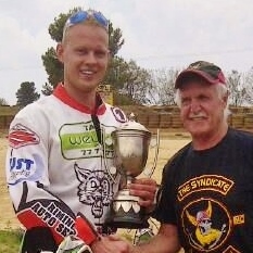 The annual 'Legends of the Past' meeting started with a new event, a race for the Henry Long Trophy. This cup, inscribed with names of initial holders like Alan Hunt, Doug Davies and Henry himself from as early as 1955 at Pretoria Stadium, was competed for by way of a difference, with four riders each racing 4 laps alone, and the third lap of each man timed to determine the winner. Byron Bekker, still recuperating from a knee operation, competed against Neil Pettit, Lyle Kotze and DJ Devine. BB's winning lap time was 15.87 seconds, with Neil Pettit not far behind on 16.26s. Lyle Kotze came in third on 17.3s, and unfortunately DJ fell in corner 1 going into his 3rd lap, so he was out of the running. Though Henry Long had planned to attend and make the presentation, on the day the 86 year old had to send his apologies and former triple SA Champion of the '70s, Arthur Bruins, duly obliged. Congratulations to Byron Bekker, good to be seen back in the saddle, if only for a few laps; here's hoping the knee gets better soon.