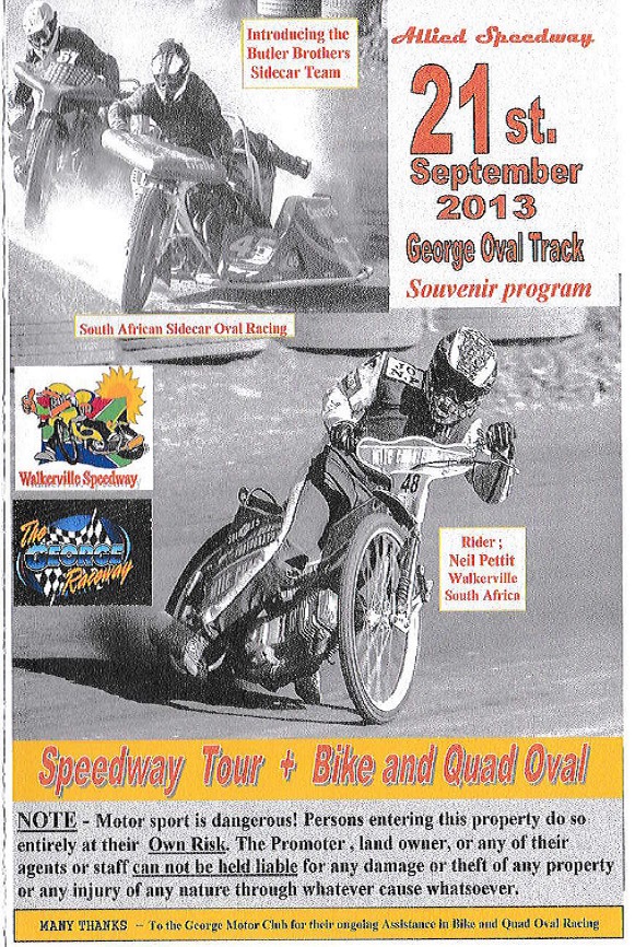 "Speedway and Sidecar racing made a welcome return to the George Oval track with the visit of four WSRC riders from Johannesburg together with the Butler brothers sidecar team from Klerksdorp in the North West Province. Despite a bitterly cold Spring evening the local fans came out in encouraging numbers for an action packed night with the speedway and sidecars supplemented by flat-track, quad bike and hot rod racing. Cont'd ......