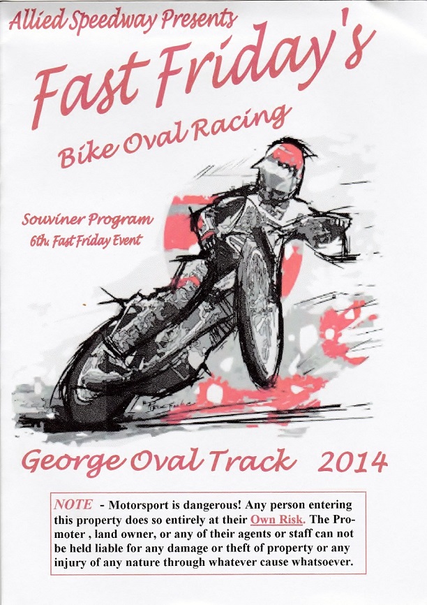 The first George race meeting of 2014 heralded a change in race day for Allied Speedway’s 'Bike and Quad Oval' shows. Meetings will now be staged on the last Friday night of every month under the banner of "Fast Friday". This will enable racing to take place exclusively under floodlights rather than the previous day/night arrangement and also prevent clashes with other weekend sports and social activities. The first "Fast Friday" at the George Showgrounds was the regular mixed programme of speedway, Quad bikes, MX Flat Track and rage buggies and attracted an healthy crowd on a fine summer's evening.