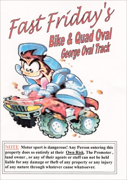 A very sparse crowd turned out on a bitterly cold night for the latest “Fast Friday” Bike & Quad Oval show at the George Showgrounds, with the number of competitors in the various racing classes appreciably down on the previous meeting, with no entries at all for the Rage Buggie division.