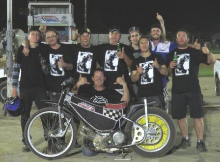 Below, the George speedway 'team': L > R Corne Kapp; Andy Saggerson; Dillon Bown; Steve (Flag