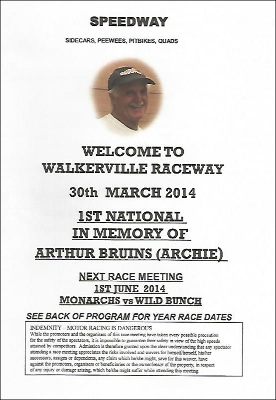 Speedway-SA is sad to report the passing of Arthur Bruins in a road accident yesterday, March 23rd, age 67. 'Archie', as he was know to his friends, was a champion of the sport of speedway, both on the track in his youth and subsequently, in present times as a committed follower and supporter of Walkerville Speedway Riders Club, where he was a generous benefactor and through his business, DOT Engineering, has been the prime sponsor of the S.African National Championship for many years, last won just 3 months ago by his own grandson, Gio Nunes.