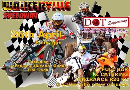 Racing returns to the Walkerville dirt oval in just 2 weeks time, on SATURDAY Nov. 7th with an all-speedway meeting, - solos and sidecars - , for the Syndicate Sidewinders Bash, staging an ever-popular speedway team match, when 'Walkerville Wizards' take on the 'Southern Speedway Riders Club Rebels', plus demos by V8 Sprint Cars. Don't miss it; gates open at 09H00, tapes up at 13H00, - a SATURDAY, remember !