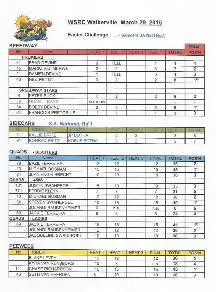 29.3.2015 Walkerville, Gauteng: Easter ChallengeNeil Pettit topped the score chart at the WSRC's Easter Challenge race meeting on Sunday, (the Challenge replacing the advertised National event for Solo speedway,) with Bobby Devine taking the 'Speedway Stars' B-class Final. The Sidecars' National was upheld and concluded with Kallie Britz securing first position in this initial round from son Konrad.