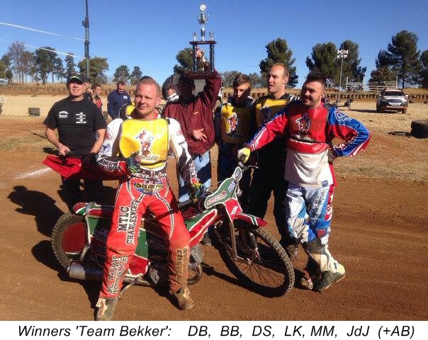 The extreme weather being experienced in the Jo'burg area of late, - a daily 30-35C in this city, 39C in Pretoria, and no respite forecast until next Friday - , brought a premature end to Saturday's special Syndicate team race meeting, compounded by the failure of the water tanker, such that the extremely dusty conditions that developed made it unwise to continue the solo speedway heats. The re-appearance of former SA champs Martin Bekker and Brendan Coughlan in the 'SSRC Rebels' team promised much, pitched up against the stars of today, cousin Byron B. and Neil Pettit, but it was unfortunate that racing had to be curtailed before the resurgents had chance to find their old pace once more. After the forth heat of team racing had to be awarded with the score standing at 14-10 to the 'Walkerville Wizards', the winners were declared, Wizards recipients of the Syndicate's prize.