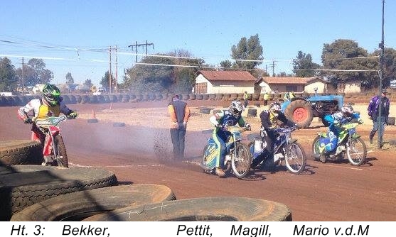 In the heats after 3 rides each holder Neil Pettit was unbeaten, with Mario van der Merwe one point behind, but in the deciding Final both fell in turn. Pettit, down in lap 2, was able to race down the remounted Mario, (down in lap 1,) and in turn brother Marcus van der Merwe, but he couldn't retrieve the lead from Cole.