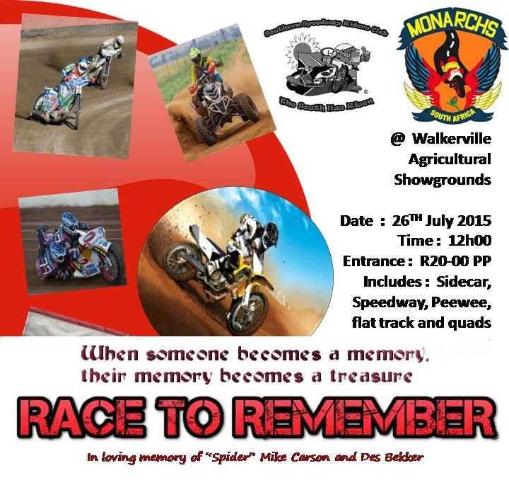 Quads, Flat-Trackers and PeeWees will complement the Solo Speedway heats in a full and thrilling race programme to see out the year. Tapes up at 13H00. Be there !