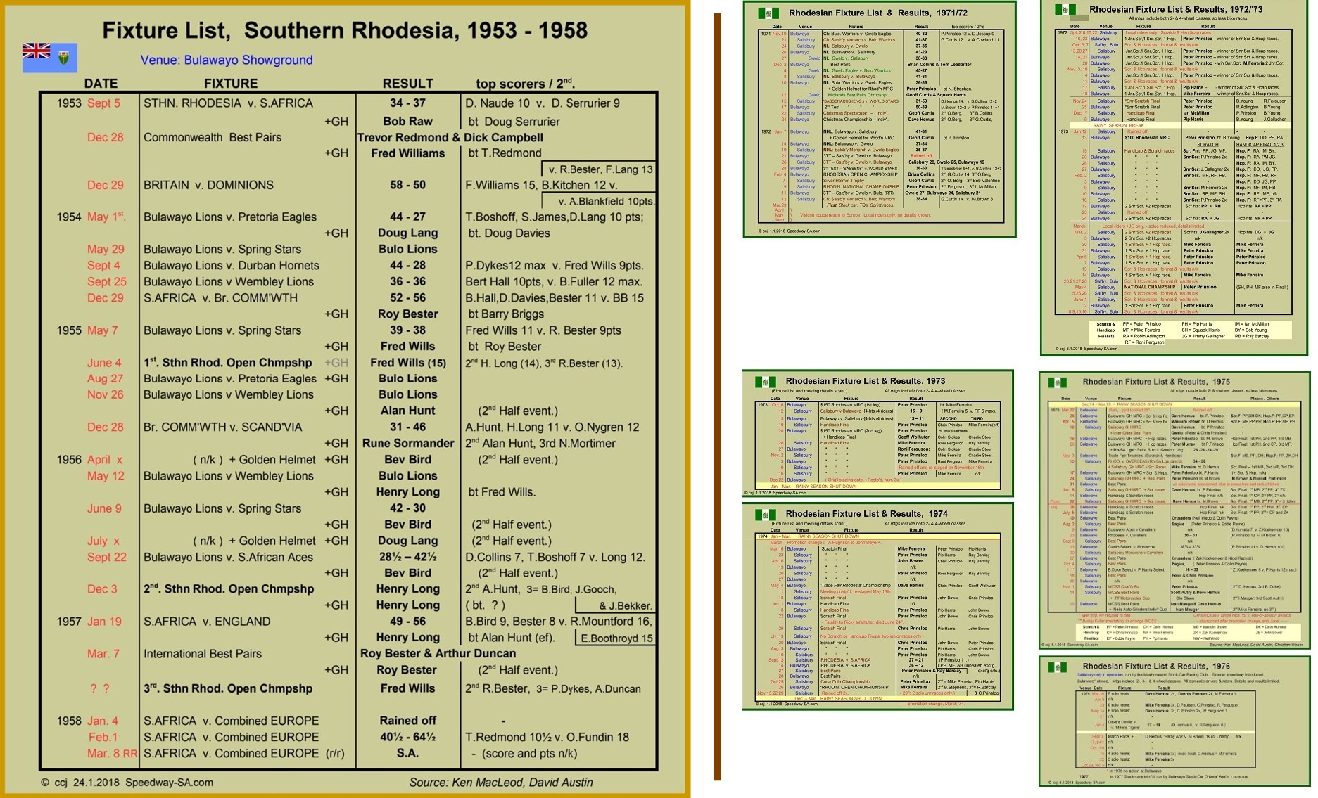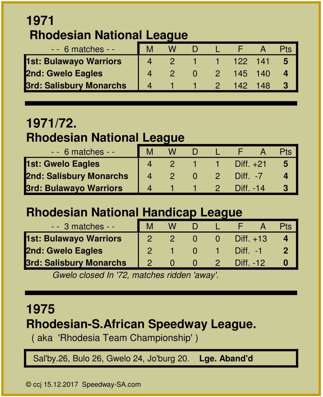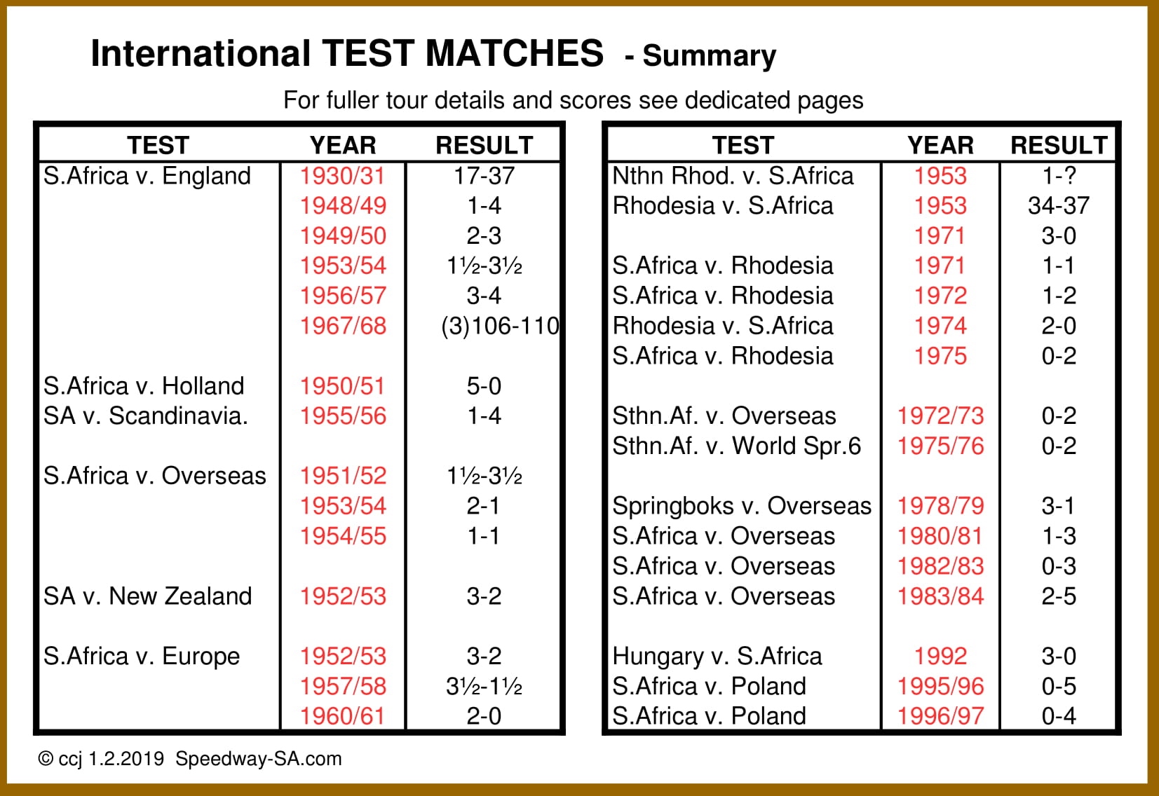 Results of Test Matches and other Internationals involving South Africa, Rhodesia, and their riders, Official and Unofficial, i.e. recognised by the sport's international governing bodies such as FIM, ACU, MSA, are given in detail on their dedicated pages, and are summarized as follows: