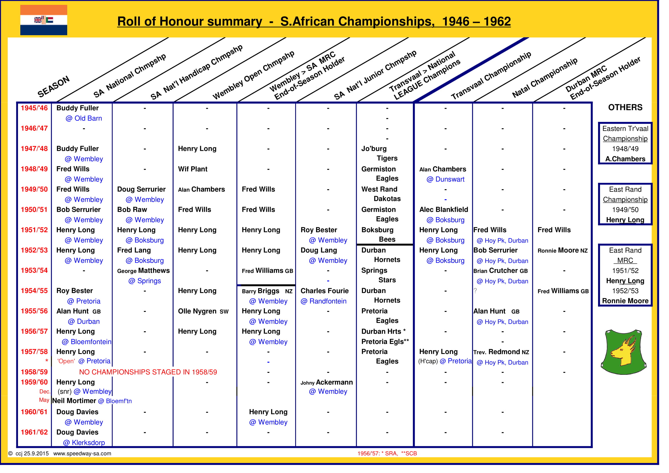 Roll of Honour 1946 -'52: SA National & Regional Championships (Click here for 1935 to date.)
