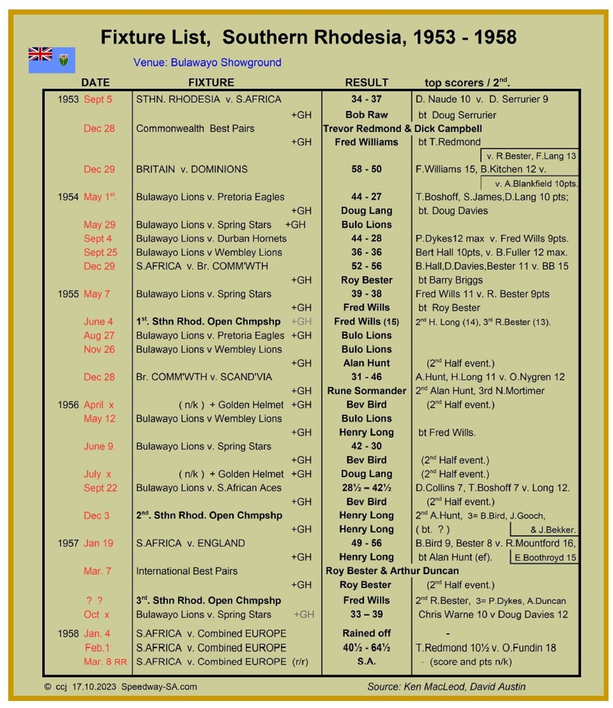 Fixtures & Results table for Bulawayo meetings of the 1950s, (meetings were staged approx. monthly.)