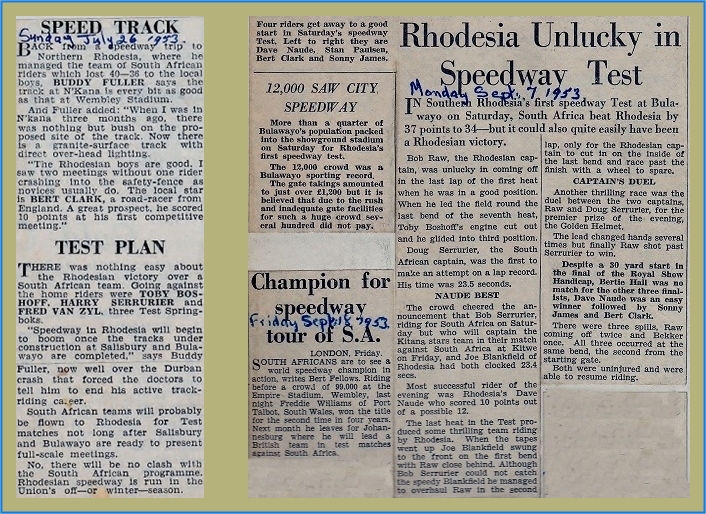 Early Days, - Kitwe and Bulawayo 1953 Shown right are press cuttings from 'The Henry Long Collection, Pt.8.' which report on South African riders in both Northern and Southern Rhodesia in the very first days. The cuttings, (click to enlarge), contain match and Test Match reports plus a group photo of the S.African and Rhodesian team members, expanded below.