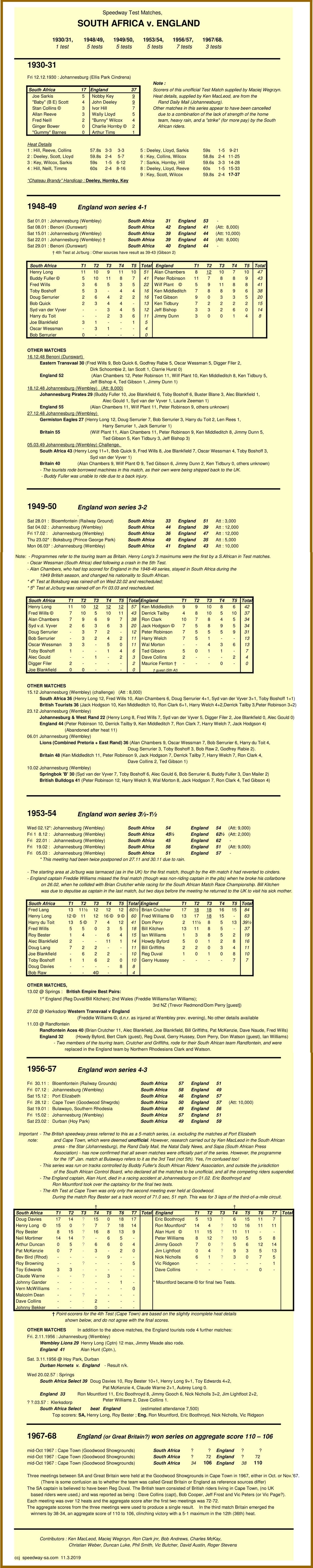 1951 Tour of Europe: Extensive details of this Tour of Europe, organised by Buddy Fuller, are separately listed as a third 'Test Match' page, with an introduction by Ken McLeod, SA motorsport journalist. The tour comprised 20 meetings, (a 21st was rained-off,) across 5 countries, over a 10 week period. Further research of on-line press archives by contributor David Austin into Dutch, Norwegian, Swedish and German news reports, released in February 2019 and complementing McLeod's SA archives, updates the initially published data with definitive details.